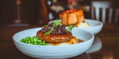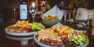 An 8oz Sirloin or a 12oz Rump chargrilled to your liking and served with a grilled tomato, mushroom, triple cooked chips and a dressed salad. Add extras starting from £1.00